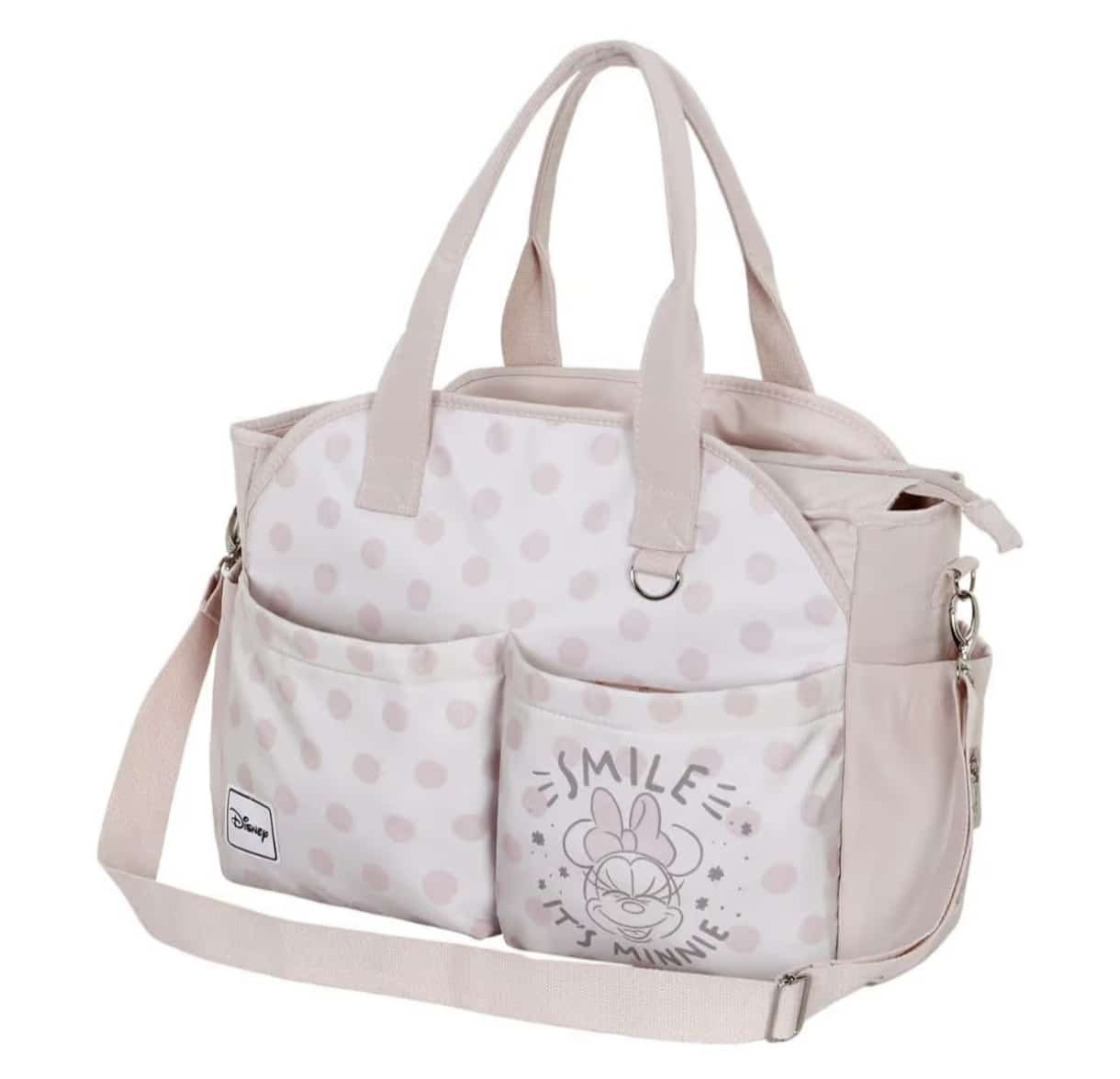 Cuenta con un forro interior con cinco bolsillos para organizar los enseres además con un bolsillo lateral y tres bolsillos exteriores adicionales. Pero si por algo te sorprenderá este bolso es por su fantástico diseño, en un elegante color salmón sobre el que destaca a Minnie y los lunares por todo el bolso.